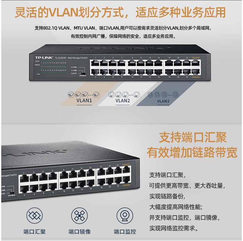 tplink24口千兆交換機16口48口百兆監(jiān)控專用網(wǎng)絡無線網(wǎng)線分流轉換交換器以太網(wǎng)企業(yè)web網(wǎng)管級VLAN匯聚SG2024D